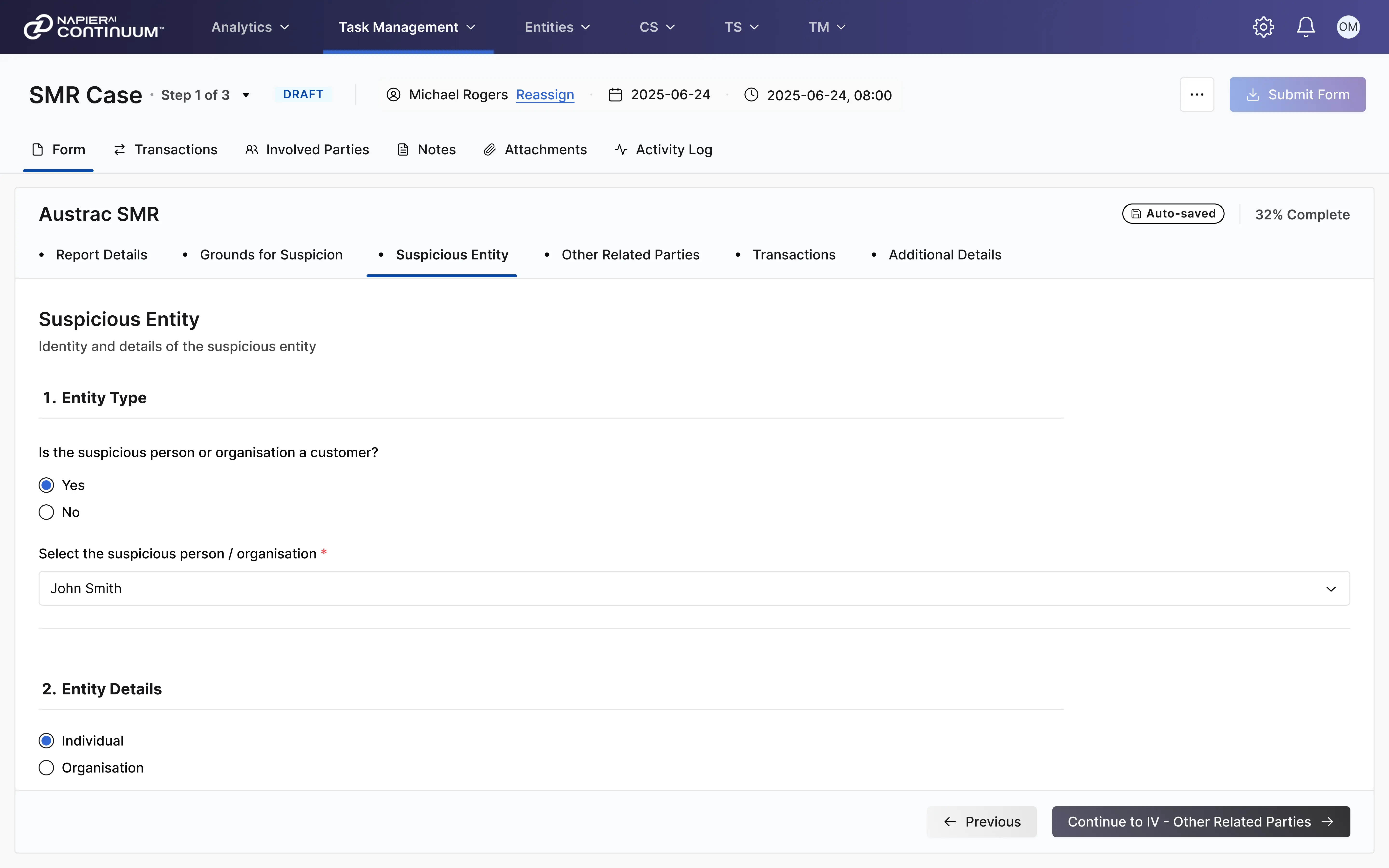 Designed to be used with Napier AI’s Transaction Monitoring and Screening solutions, the Regulatory Reporting Manager helps compliance teams move from investigation to regulatory submission in one workflow.