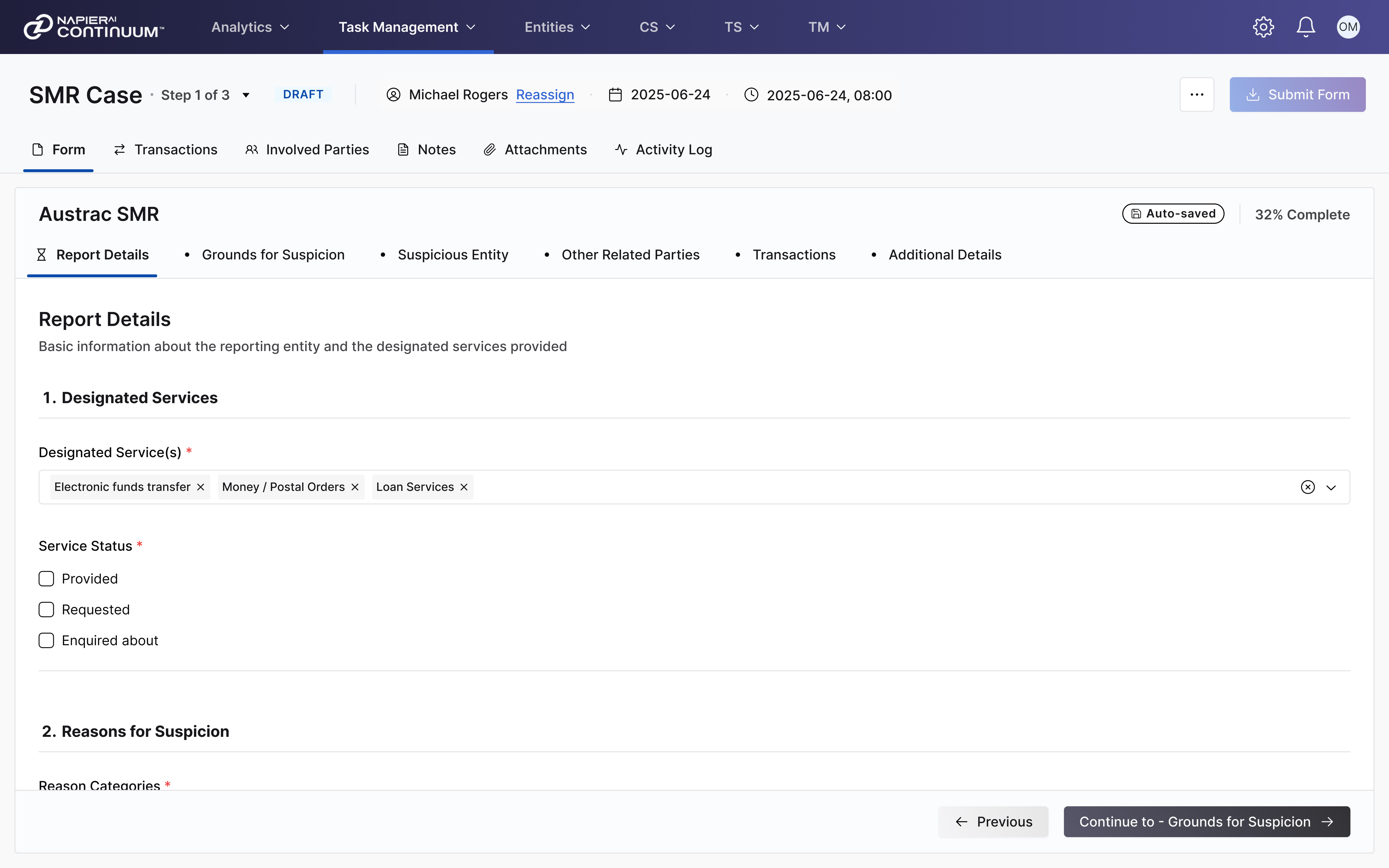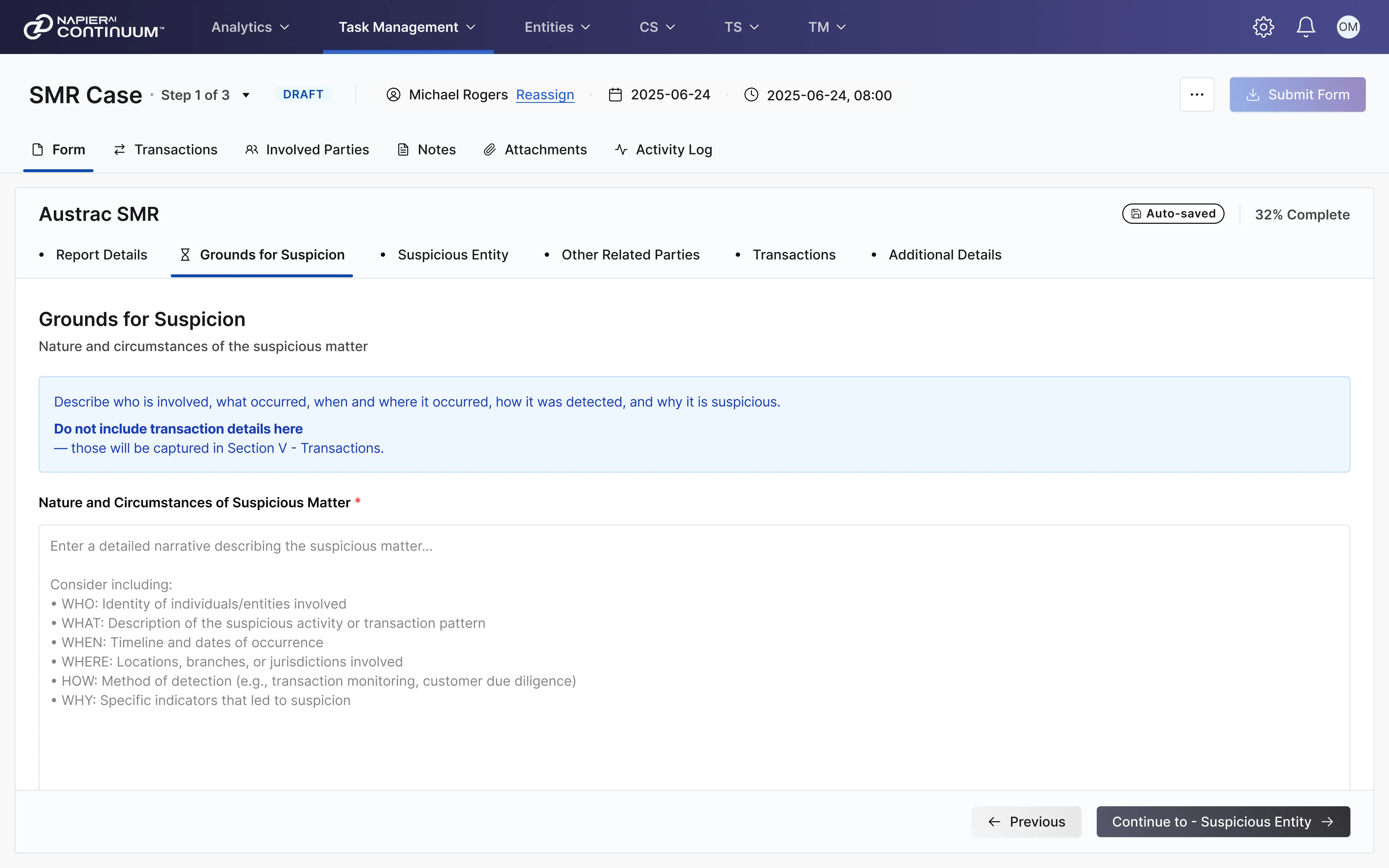 By using investigation context to auto-populate report fields and combining structured workflows with built-in validation, it reduces manual effort, improves consistency, and supports timely, compliant filing.